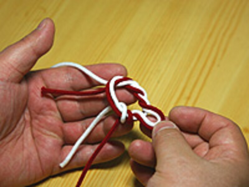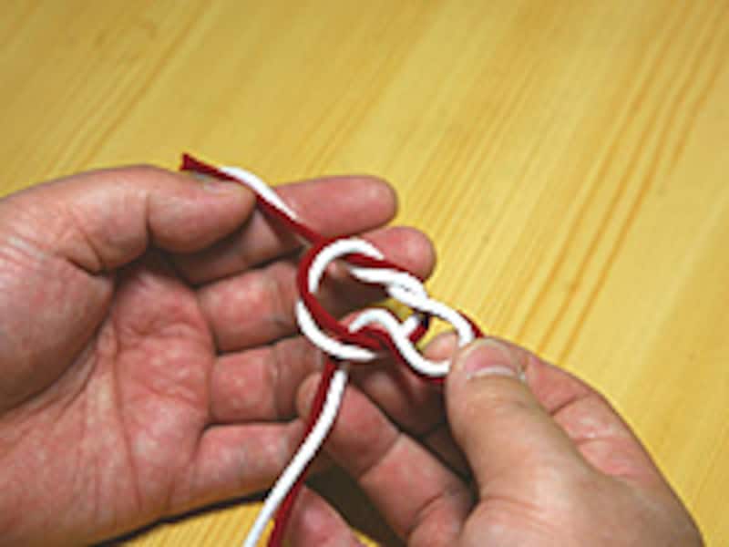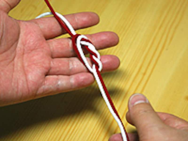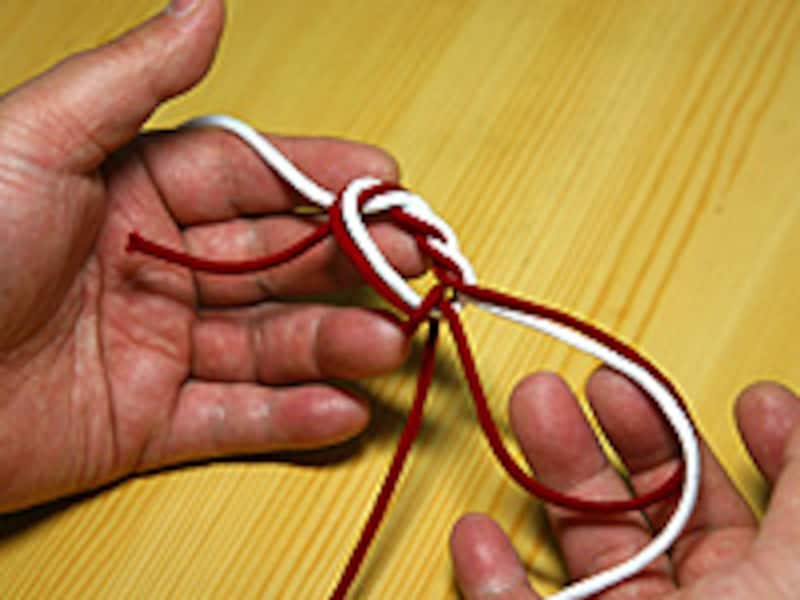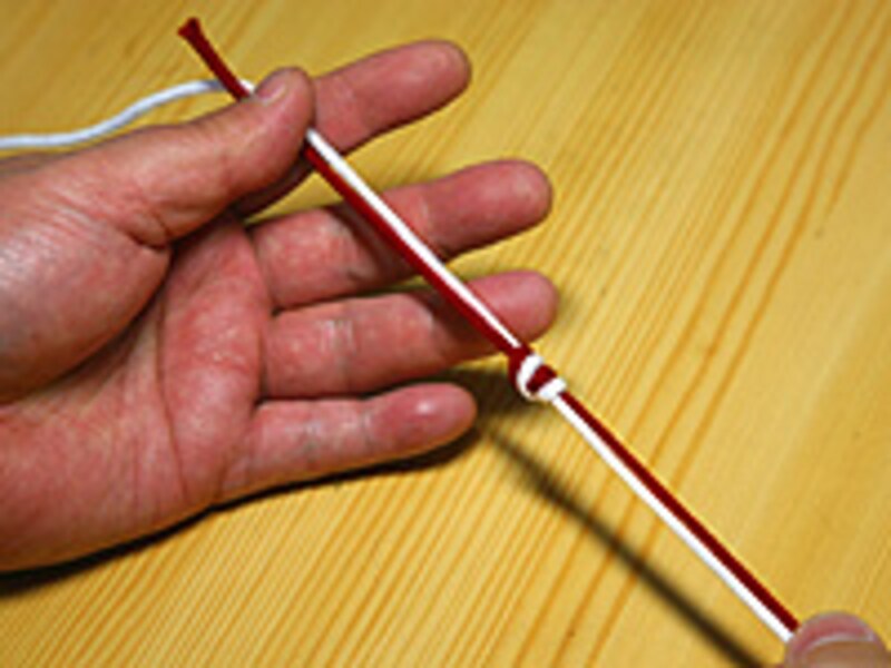 6.両方のラインが輪をくぐるとこうなる。あとは両端の2本のラインを持ち、ゆっくりと絞ってゆく。ラインが細いのでツバで湿らせてから引っ張ると、キレイに結べる。