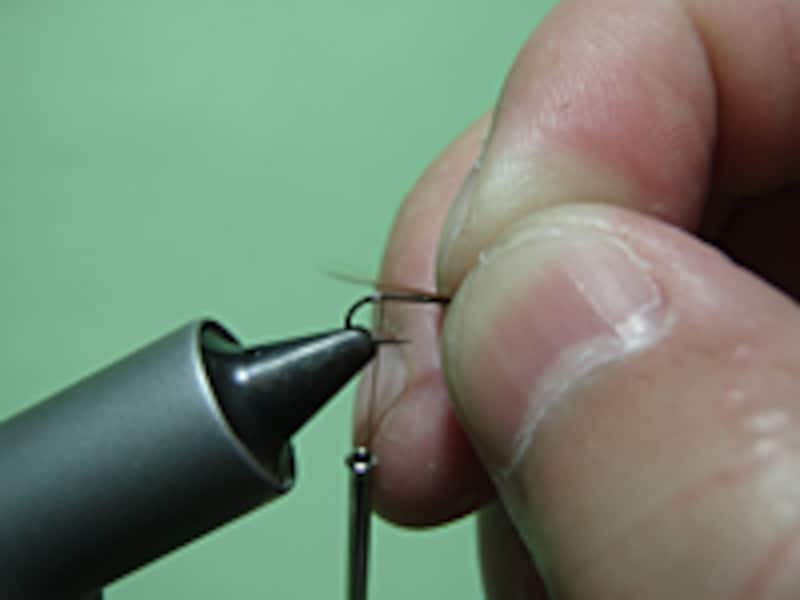 まずはテールを取り付ける。テールとなるファイバーは先端を揃えて10本ぐらい用意しておこう。長さがバラバラだと美しくないので、いったん手に持ったファイバーは決してずらさない。テールは基本にシャンクと同じにするので、このように長さを測っておこう。