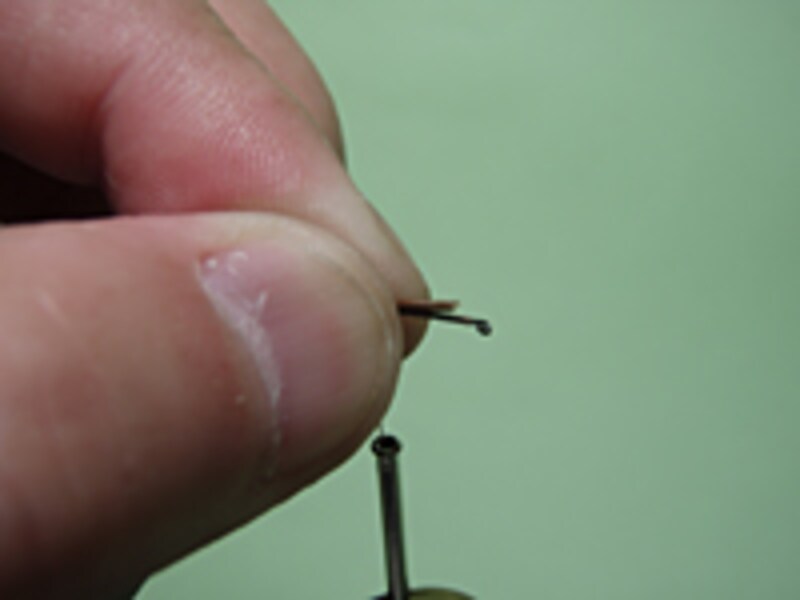 テールが無事についたので、次はボディーを作る。少量のボディー材を手にとったら、画像のようにスレッドに撚りつけていく。フックサイズにもよるが、このように薄いんじゃないかな? と思ってしまうほどでもよい。