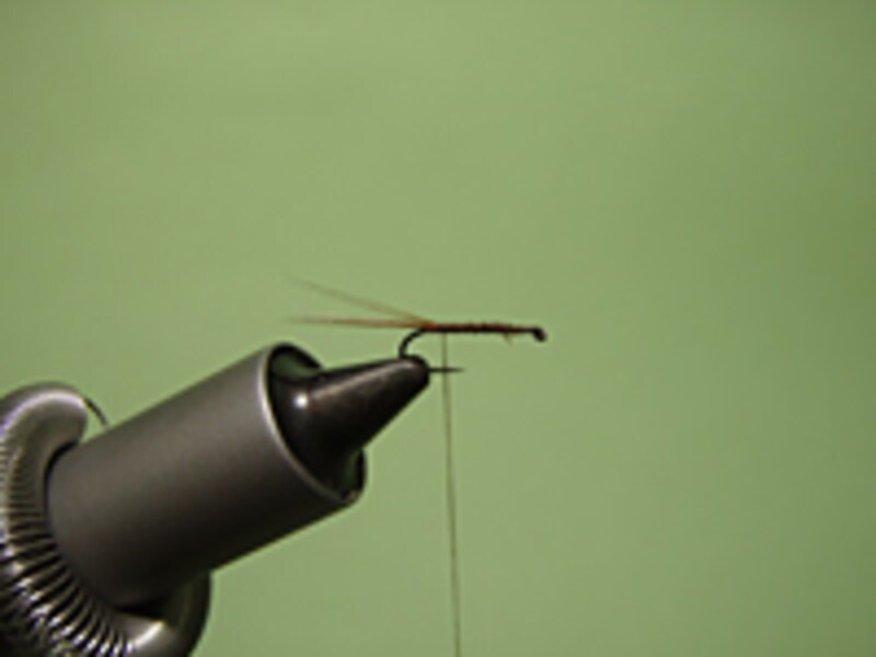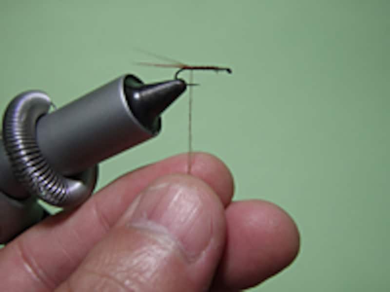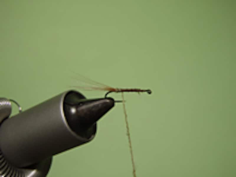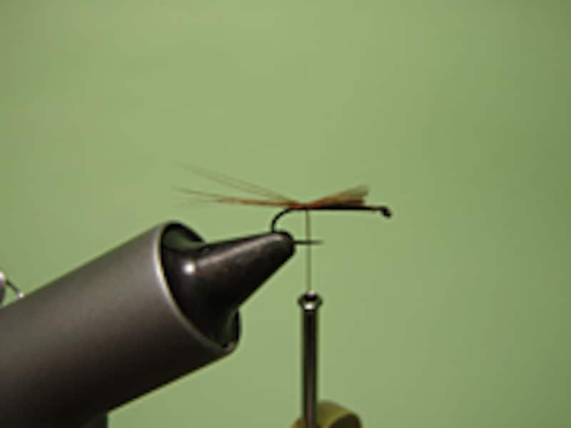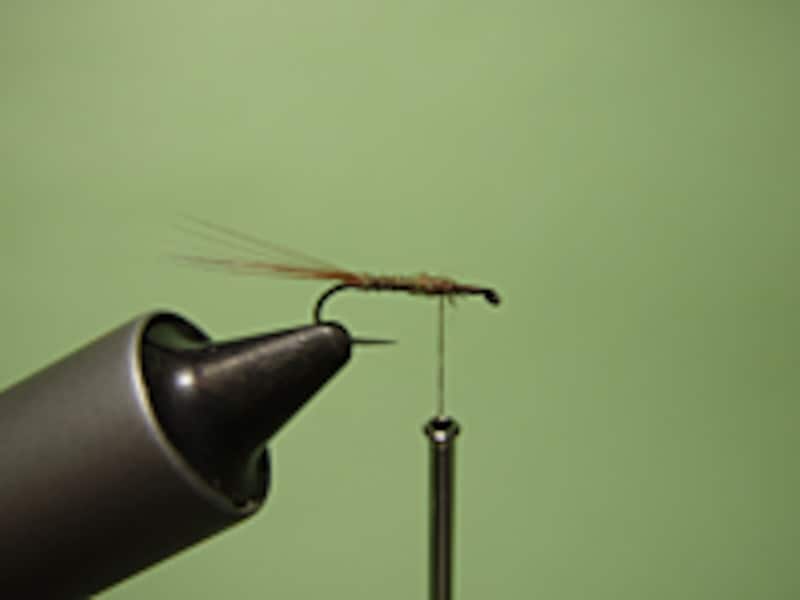用意するマテリアルはドライフライ用のボディー材とコックネックハックル、そしてテールにも同じコックネックを使用する。ボディー材はドライフライ用の化繊タイプが使いやすい。コックネックはフックサイズに合うものをショップで事前に購入しておこう。テール材はファイバー(一本一本の毛の部分)が長めのコックネックハックルを利用すればオーケーだ。バイスにフックをセットし、下巻きをしたらいよいよタイイングだ。