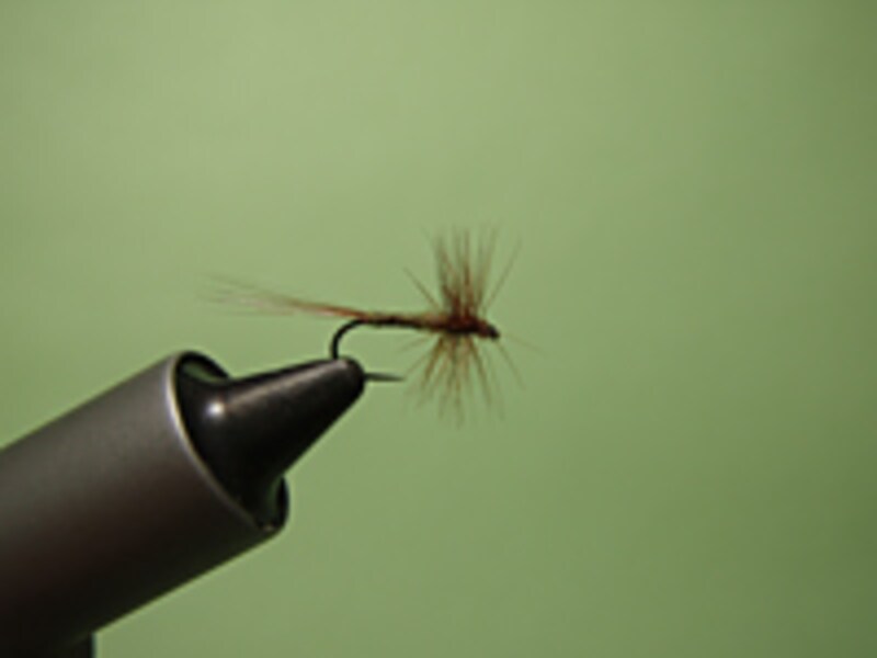 仮止めをしたらハックルのあまりをギリギリでカットし、最後にウィップフィニッシャーでしっかりとめる。ハックルが邪魔なときは手で後方にしごくようにして作業エリアを広くしよう。これで壊れるようならこのフライは失敗作だ(笑)。しっかりフィッシュできたらスレッドをカットしておこう。