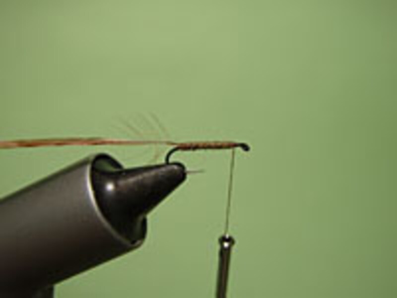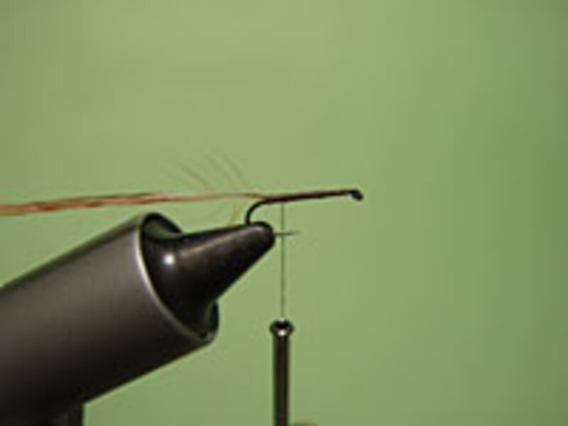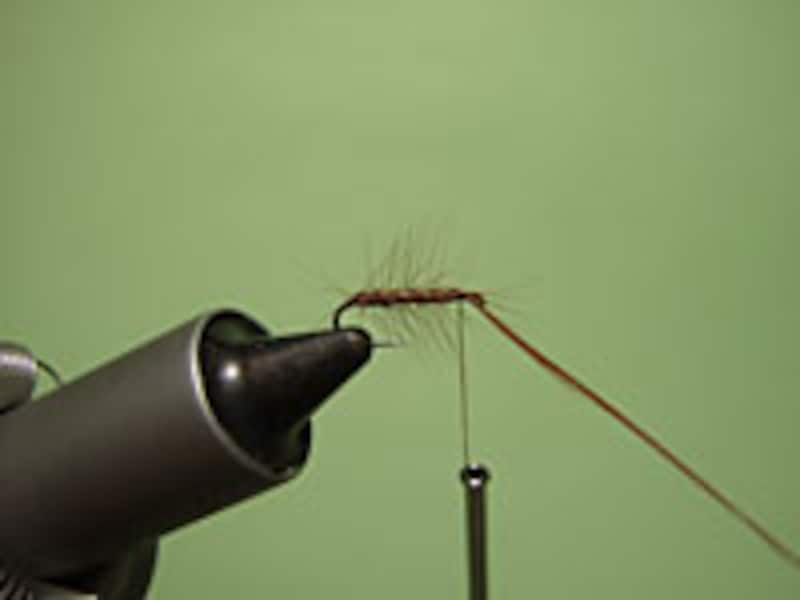 ボディー材をスレッドに撚りつけ、ボディーを作る。アイの後方にはエルクヘアーがくるので少し隙間を作っておこう。