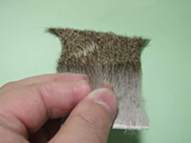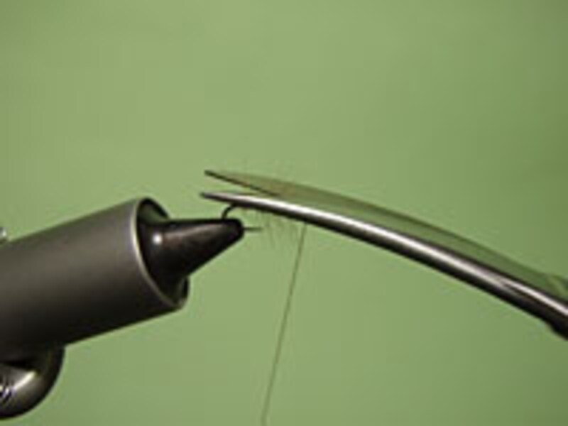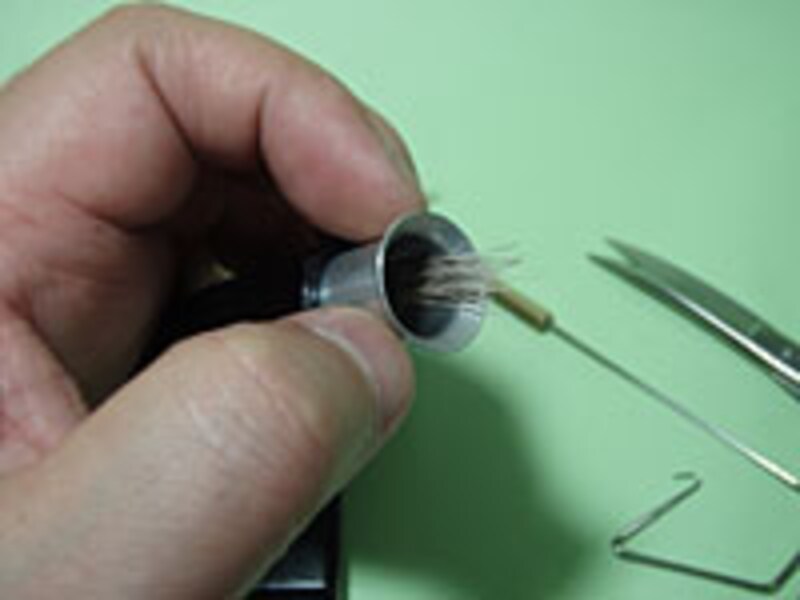 エルクヘアーを少量つまみカットする。エルクヘアーの量に規程はないが、あまりボテっとしないほうが良く浮いてくれる。仕上がりがザンバラになる程度の量が基本だ。