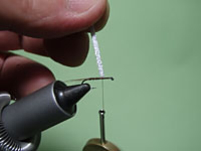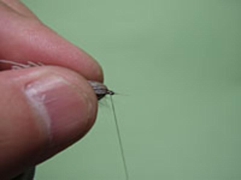 一度セットしたエルクヘアーが動かないように手を持ち替えてテールをつける要領でスレッドを2回転させる。スレッドでとめても指はまだ離さないようにする。