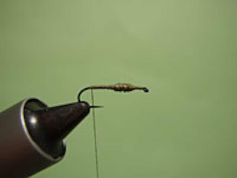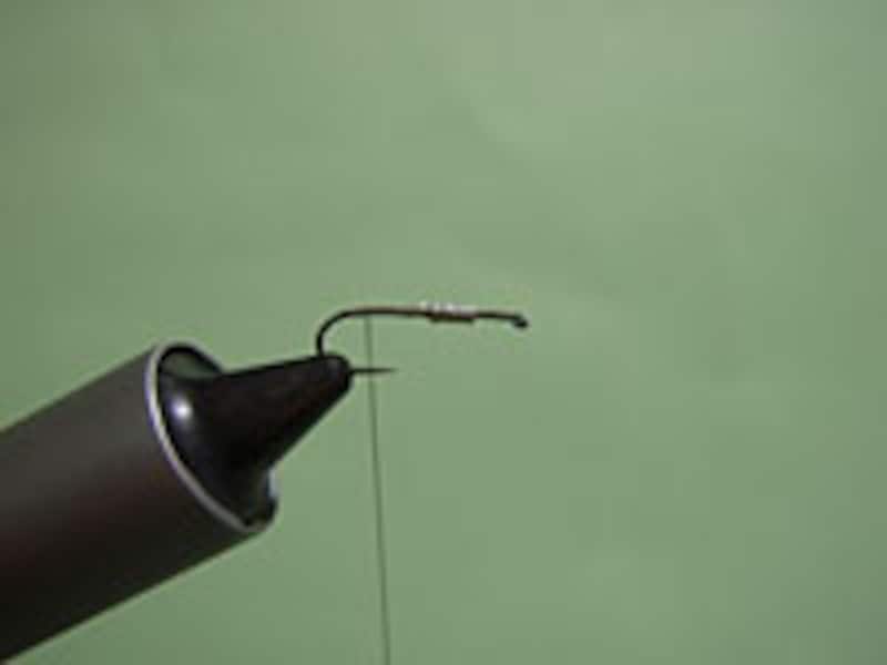 下巻きをしたらリードワイヤーをシャンクの1/3辺りを中心に巻きつける。当然、たくさん巻けばそれだけ早く沈むフライになる。このパターンの場合、5~6回転を基本に釣り場に合わせて量を決めよう。