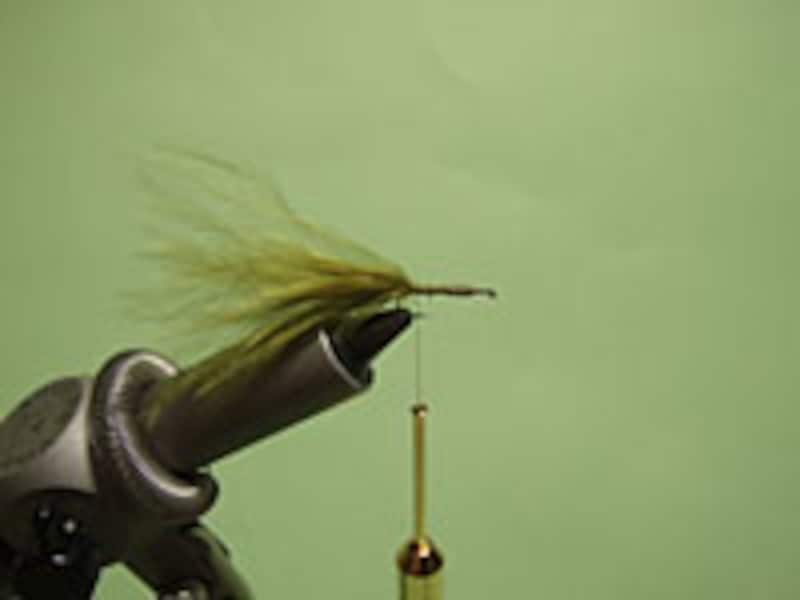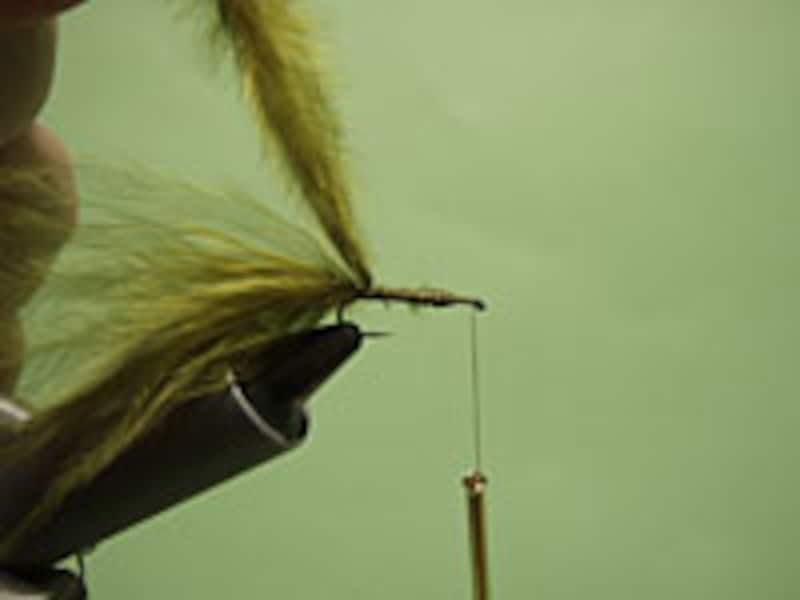 マラブーを15~20本ぐらいとり、テールの位置に固定する。ガイドはいつも多めで長めに作る。マラブーは指で簡単にちぎれるので、釣り場で量や長さを調整するためだ。ちなみに、大概のマラブーは根元に近い部分に質の良い羽毛が集中している。初心者のウチはケチらず、良いところだけを使うと仕上がりがキレイになるぞ。