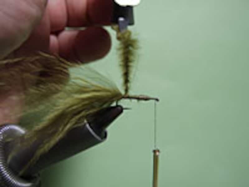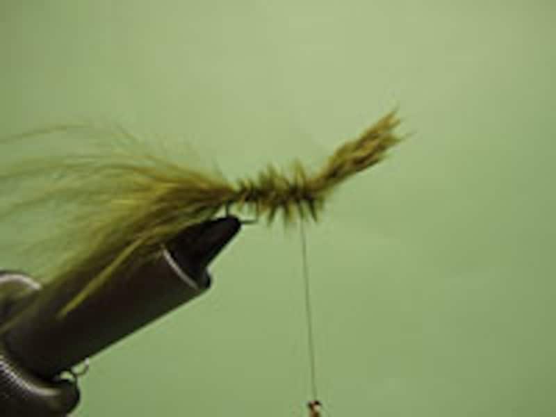 テールと同量かちょっと多めのマラブーを切り取り、今度は先端をボディーの後端に取り付ける。スレッドはアイの近くへ移動させておこう。