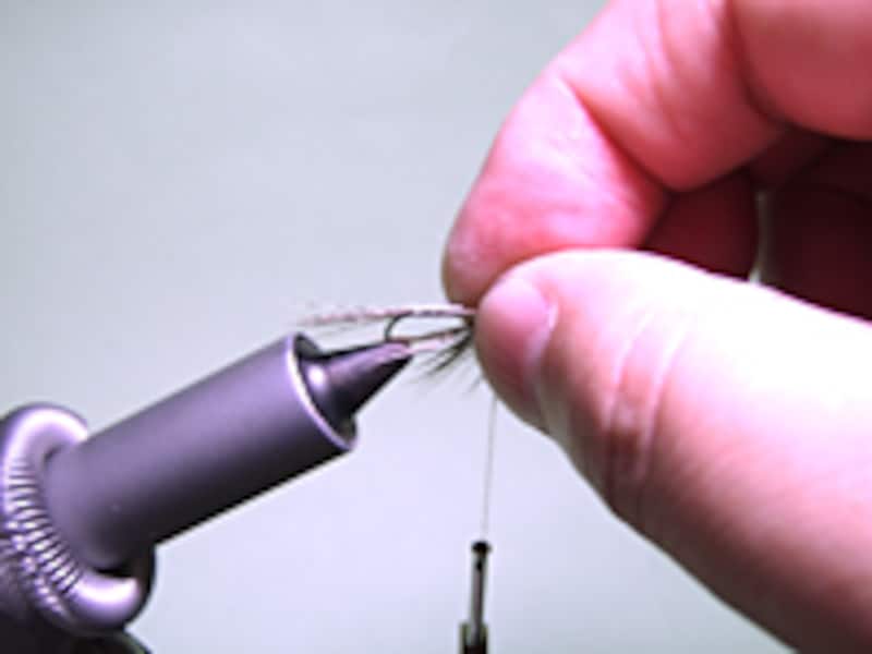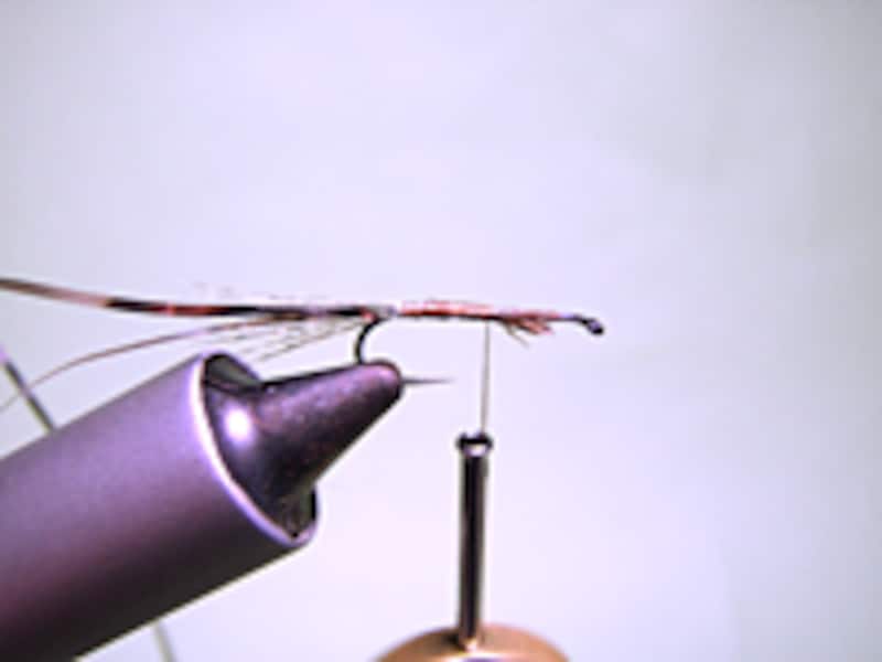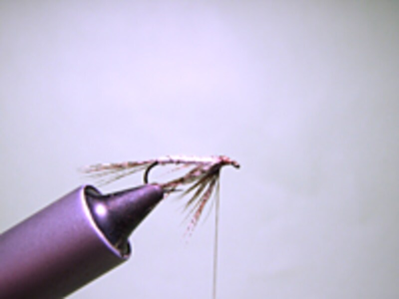 オレンジ・パートリッジの要領でパートリッジのハックルを巻いたら、全てのハックルファイバーが下に向くよう指で撫で付けておく。ファイバーの長さはフックのポイントに掛かるか、ちょっと長めがよい。