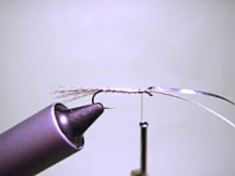 スレッドをアイの手前3mmぐらいまで巻き戻したら、オーバーティンセルでボディーを作りって一度巻きとめる。リブ用のオーバーティンセルは隙間が均一になるように注意して巻いてゆき、同じ位置で巻きとめて余分をカットしよう。