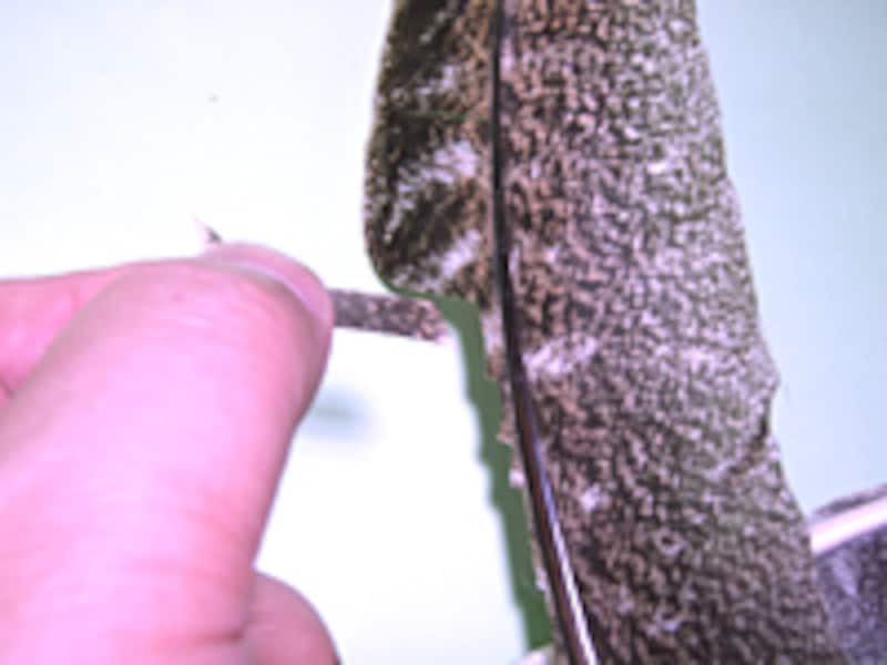 左右のクイルからウイングになる部分を切り出す。太さはシャンクとフックの幅ぐらいにするのが基本。