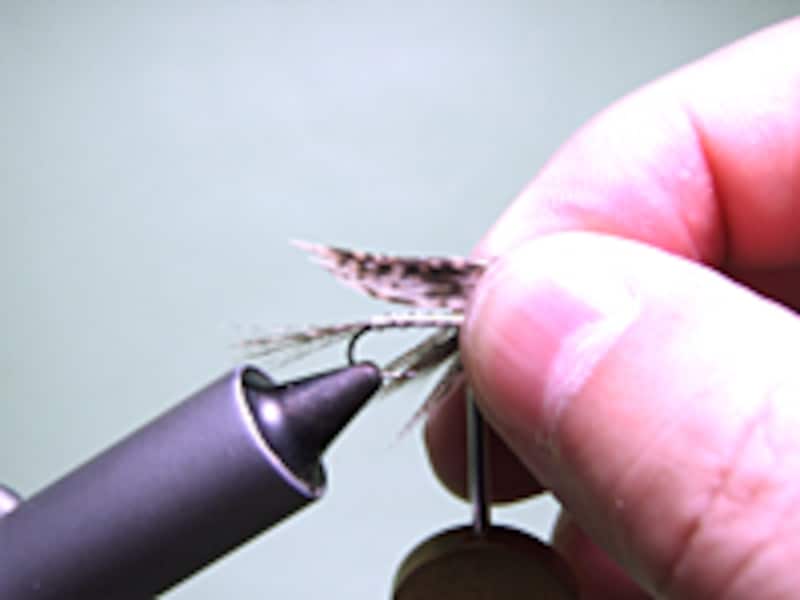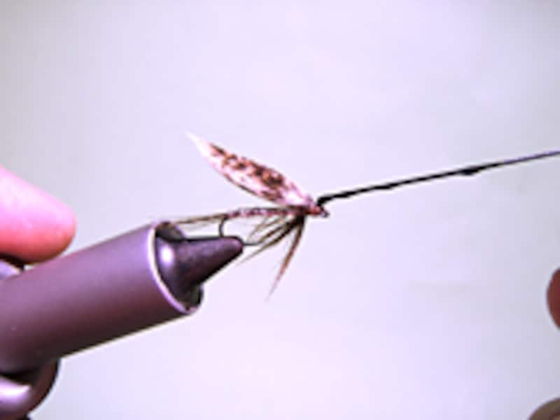 ウイングの固定だが、最初は2回転ほど緩めにスレッドを掛けて一気に絞るように引っ張ってやると上手く行く。難しい作業なので何度も練習しよう。角度によってフライ全体の印象が変わるので、何通りか試してみると経験になる。