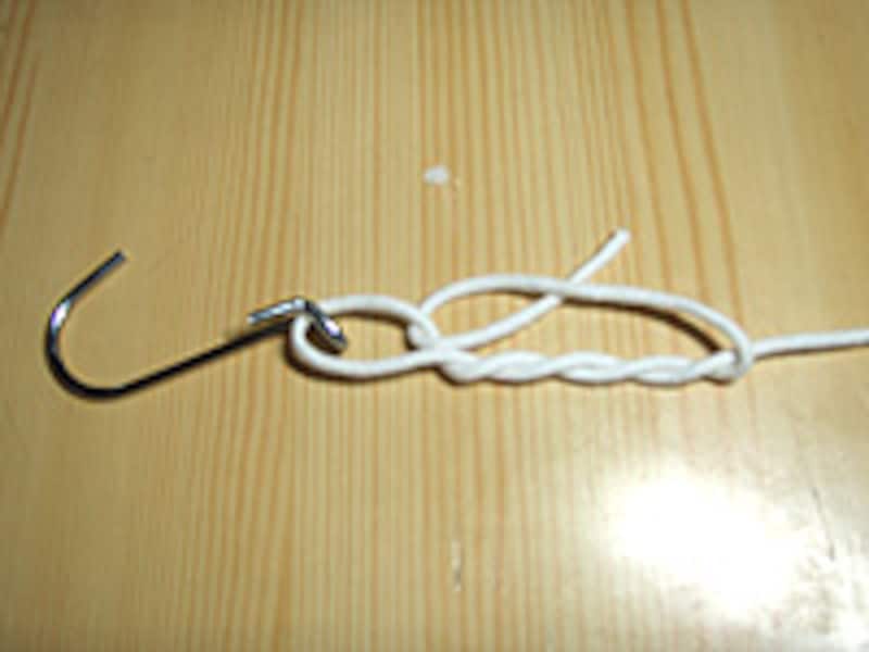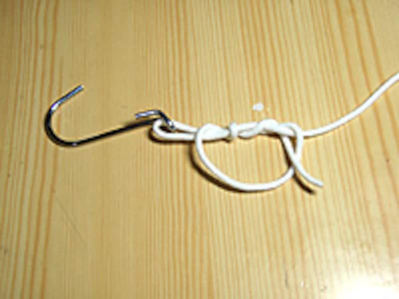 2.ラインの先端をあらかじめ作った輪に通し、こちらも固結びの要領でメインラインごと結んでやる。