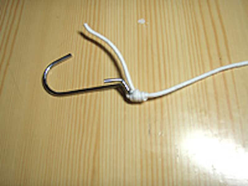 結びの王様とも呼ばれるクリンチノットは他の釣りでも非常によく使われるもっともオーソドックスなノットだ。画像を見てもらえればお分かりの通り、シンプルなので強度も高いので安心してオススメすることができる。コツは結ぶときにツバなどでちょっと湿らせてからゆっくり締め込むこと。そうすることで、結び目のすぐ上が縮れたりしなくなる。慣れてくれば数秒で作れるので、まずはこれから覚えておくのもよいだろう。