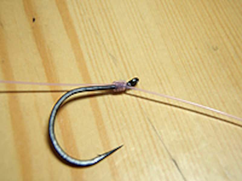 1.ラインをリング部分に通したら、短いほうをメインラインに4、5回転ほど巻きつける。使っているラインや輪の太さにもよるが、基本的に4回以上巻けばオーケーだ。
