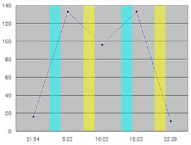 青いラインが上げ7分、黄色いランが下げ3分。こうしてみると、どんなタイミングで魚の活性が上がりやすいか良く分かる