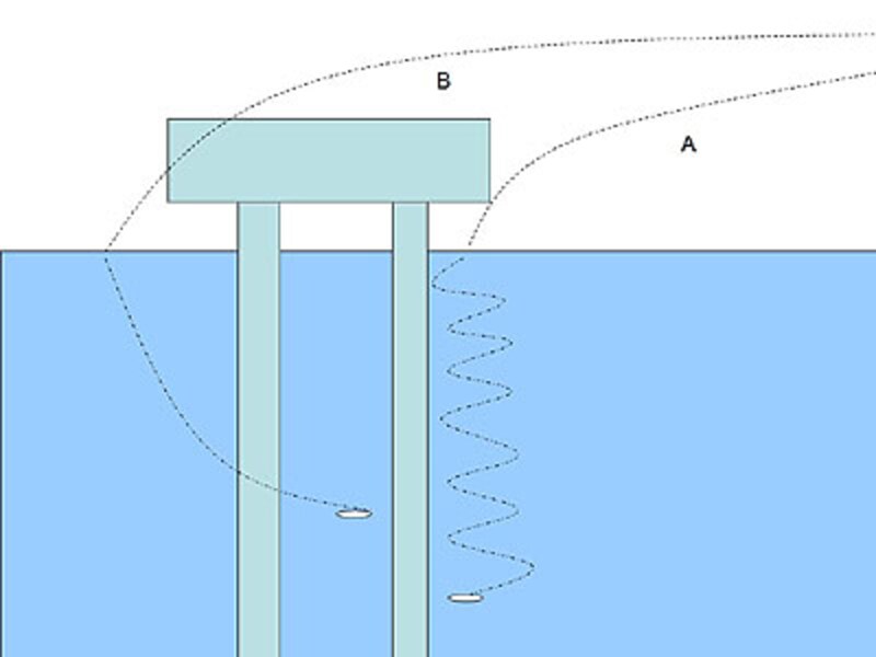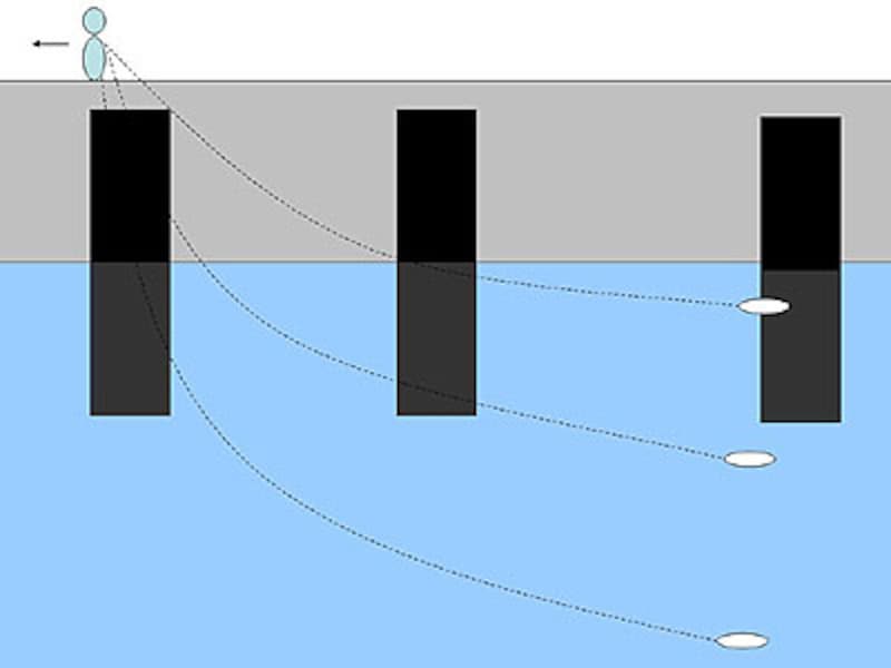 Aの軌跡がフリーフォール。Bがカーブフォールのイメージ。こうやって角度を変えてルアーを流せばシーバスとの出会いも多くなるのだ。ちなみに、フリーフォールはルアーが着水してからもリールのベイルをフリーにしておき、自然に落下させるテクニックのこと。カーブフォールはルアーが着水したらベイルを戻し、水中で弧を描かせるように落下させるテクニックだ。