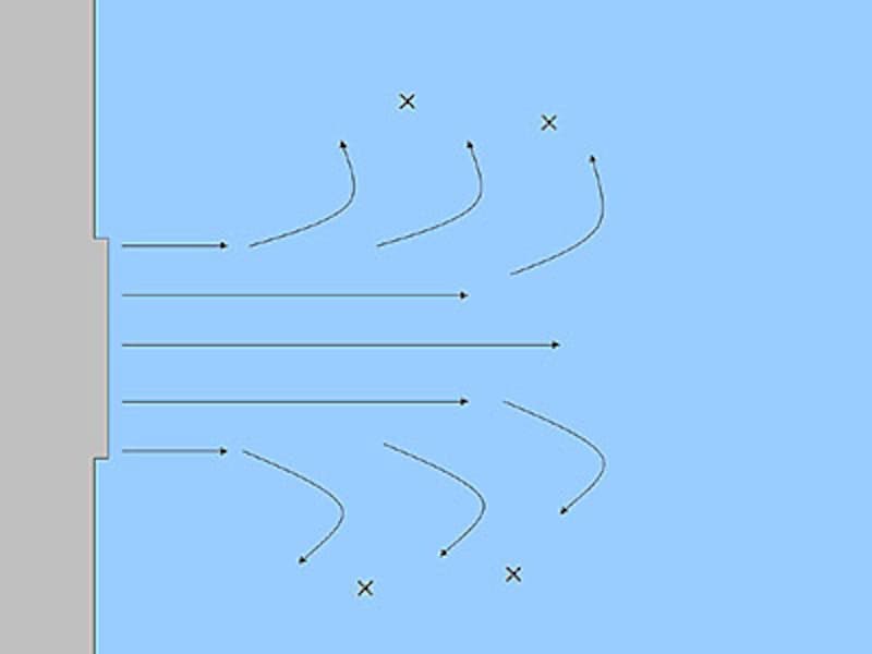 流れ込みでは流れが最も強い流芯よりも、その周囲の反転流にシーバスが居ることのほうが多い。流れに対してやや上流側にルアーを投げて、流れに負けてヨロヨロと落ちてくる小魚を演出してみよう。ルアーのチョイスがあっていれば、派手な水しぶきと共にガツンと喰ってくるはずだ。