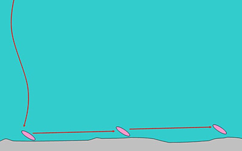 カーブフォールのイメージ。このメソッドは沈下スピードを長くとることができるのが特長。イカの気配はあるのに乗らない、というときに試してみるとよいだろう。