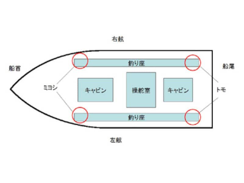 これは船を上から見た図。キャビンの位置などは各船によって違うが、基本的に船主(前)側の釣り座を「ミヨシ」、船尾(後)側の釣り座は「トモ」と呼ぶ。進行方向の右の席が右舷側、左側は左舷側になる。ボートシーバスの場合はストラクチャーに近づいてキャストしたりするので、潮流や風向きによって、どちらかの舷に固まったり、場合によってはミヨシに固まることもある。どの場合もスタッフのアドバイスを良く聞いて行動しよう。