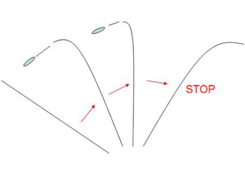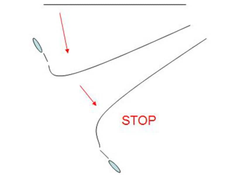 そしてこちらがコンパクトなオーバヘッドキャストを図にしたもの。両者を比べれば分かると思うが、テイクバックの動作を最小限にすることで小さなフォームでも大きな飛距離を作ることが可能となる。船の両舷で釣りをしている場合は、お互いのルアーが交差するようなこともある。トリプルフックが体に刺さったりすれば大惨事なので、投げる前には必ず後ろをチェックすることを忘れないようにしてほしい。