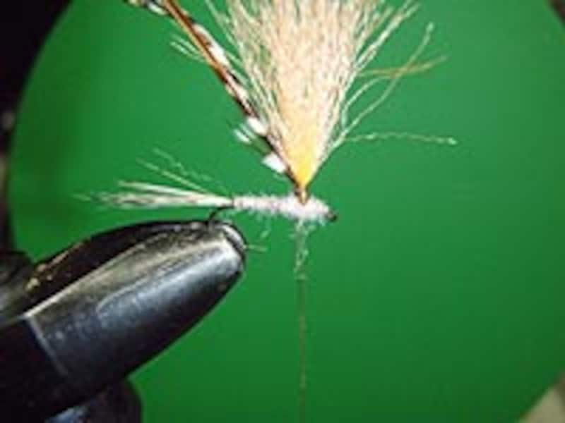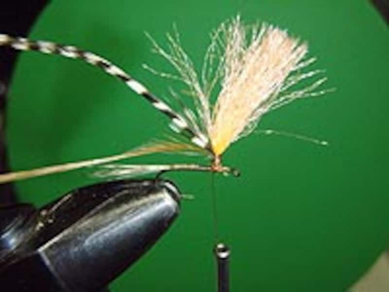 ハックルを両方ともハックルプライヤーでツマんで巻いてゆく。フックサイズにもよるが、2~3回転でオッケーだ。巻き終わったらハーフヒッチをしてフィニッシュしてセメントで固定すれば出来上がりだ。