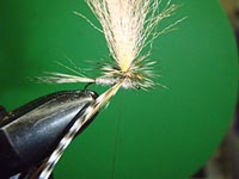 テールをとめてポストを立てたら、グリズリーとブラウンのハックルを両方とも巻き留めておく。グリズリーが上に来るようにすると視認性も上がる。この画像ではコック・デ・レオンのファイバーをテールにしているが、オリジナルはテールもグリズリーとブラウンファイバーのミックスだ。