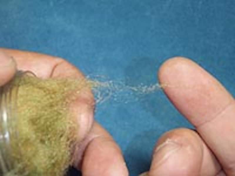 ドライフライ用のボディマテリアルを用意する。細い繊維を画像のようにほんの少量引き出しておこう