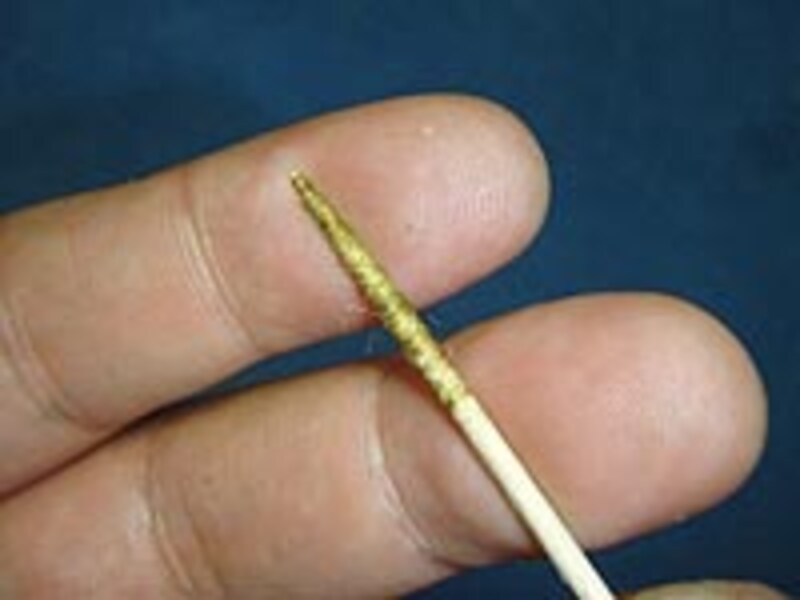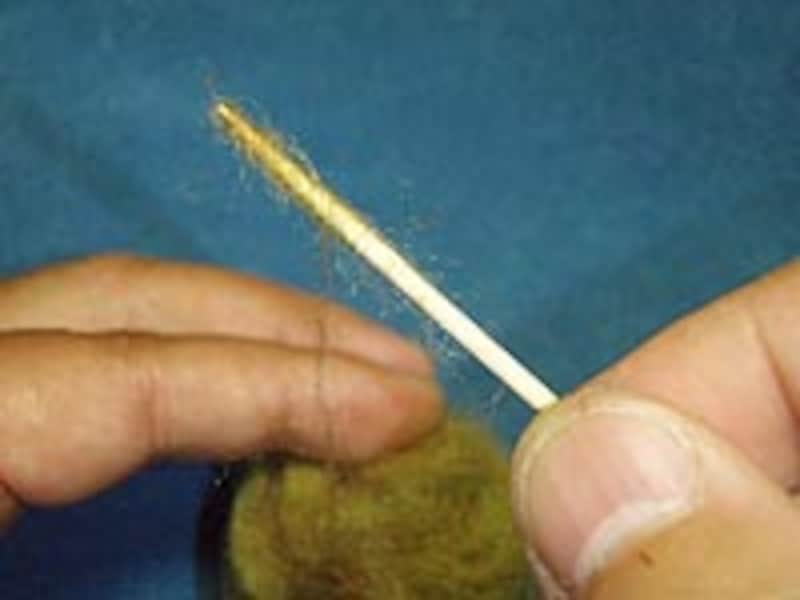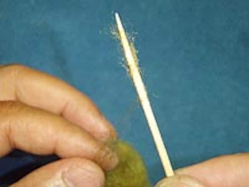 繊維を爪楊枝に絡ませてゆく。この絡ませ方が重要で最初は爪楊枝の先から根元方向、次に根元から先へ、といったように斜めに格子状になるようにすると丈夫なボディになる。