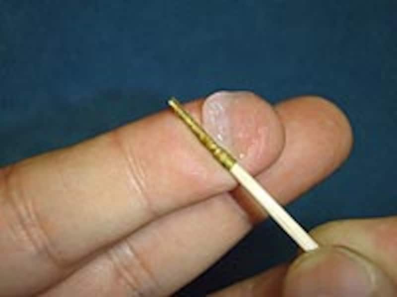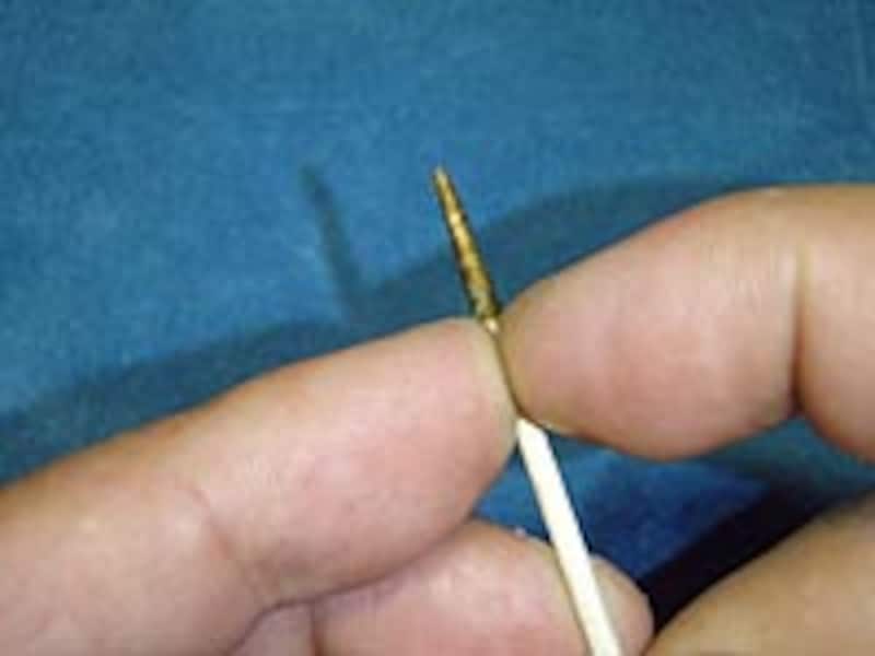 爪楊枝に絡ませた繊維の間に入るように軽く回しながらシリコンを塗ってゆく。全体的に薄く馴らすようにするのがコツだ。多く塗りすぎた場合は、指の乾いている部分でしごきとるようにすればよい。