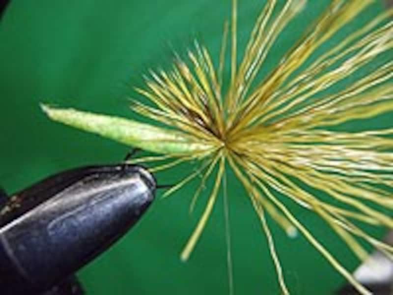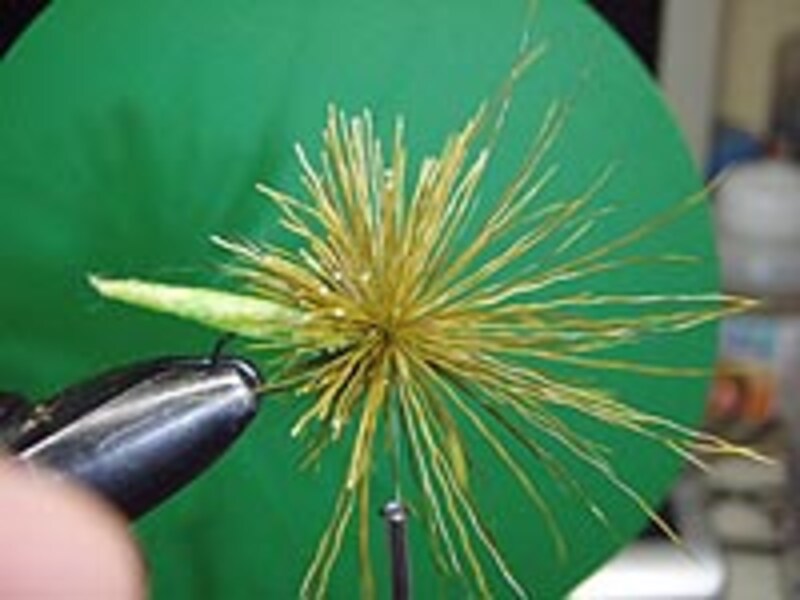 フレアさせたエルクヘアをトリミングしてゆく。一度に刈り込もうとしないで、少しずつやればよい。バイスから外して全体を見ながらヘッドの大きさを決めてゆくようにすれば失敗がない。