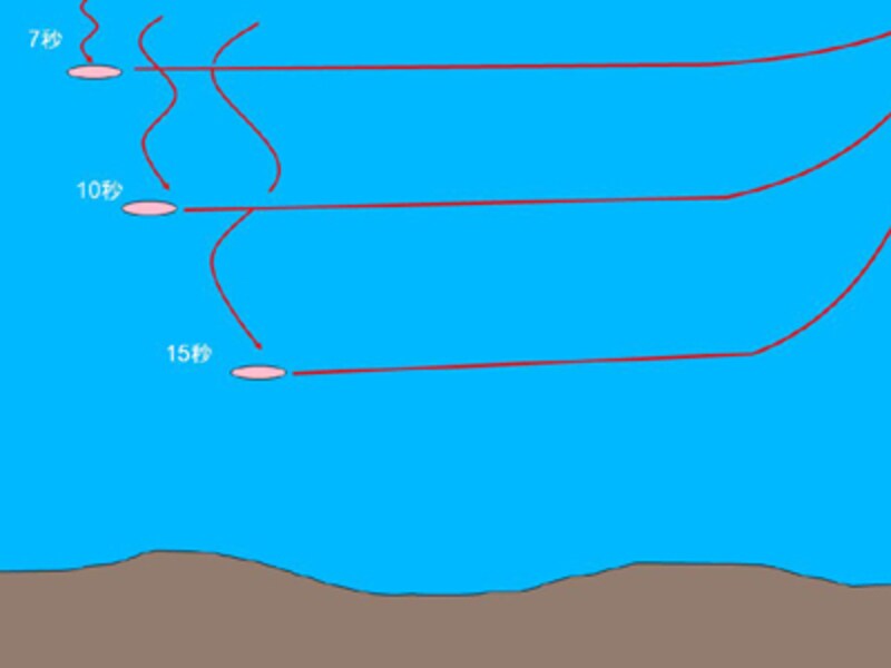 上の図はカウントダウンをイメージしたもの。このように秒数を計って沈めて一定層をリトリーブするだけだが、中層を効率的に探るにはやみくもにカウントダウンするだけでは不十分。普通にやっているだけではリトリーブしたとたんにルアーが浮き上がり始めるので、一定の層をトレースすることは難しいのだ。ここで気がついて欲しいのはサーフェースをファストリトリーブしたときのテクニック。サーフェースのときはロッドの角度に気をつけながら水面から飛びでないスピードを維持するメソッドを紹介したが、ここでもそれが役立つのだ。あえてコツを書き加えるなら、ルアーの重量に気を使うこと。リトリーブ速度を速くしたいならば重いもの、リトリーブ速度を遅くしたいなら軽いルアーを使うと一定の層をキープしやすくなる。ただそれだけのことだが、これが実に効果的なのだ。