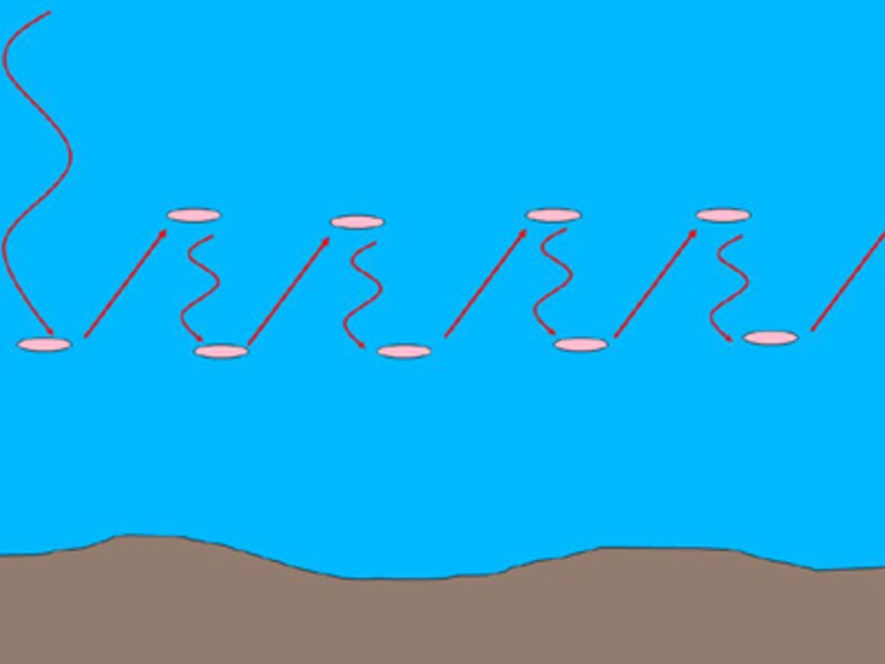 ルアーをリトリーブするだけではアピールが不十分だと感じたら、ジャークを加える。ただし、アクションを加えるとルアーは浮き上がりたがるので、ここでもちょっとしたコツがある。一回のアクションをロッド操作だけで行ったとしよう。ロッド操作によって浮き上がるのはロッド長にもよるが、全長を超えないと仮定する。すると一回のアクションで約2~3m浮き上がると判断できるので、ワンアクションにつき2~3m分のカウントダウンをしてやるとよいのだ。![]() |