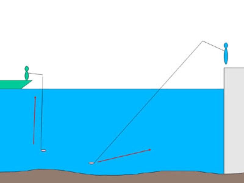 船からの釣りとは異なり、上の図のようにショアキャスティングゲームでは遠投したときの鯛カブラは横方向の動きとなる。”イソメが浮上する”というイメージとは若干異なってしまうので、ガイドは水深のあるポイントで斜に浮上させるときに使ってみたり、ボトムバンプさせることでラバージグ的な使い方をしたりして使っている。