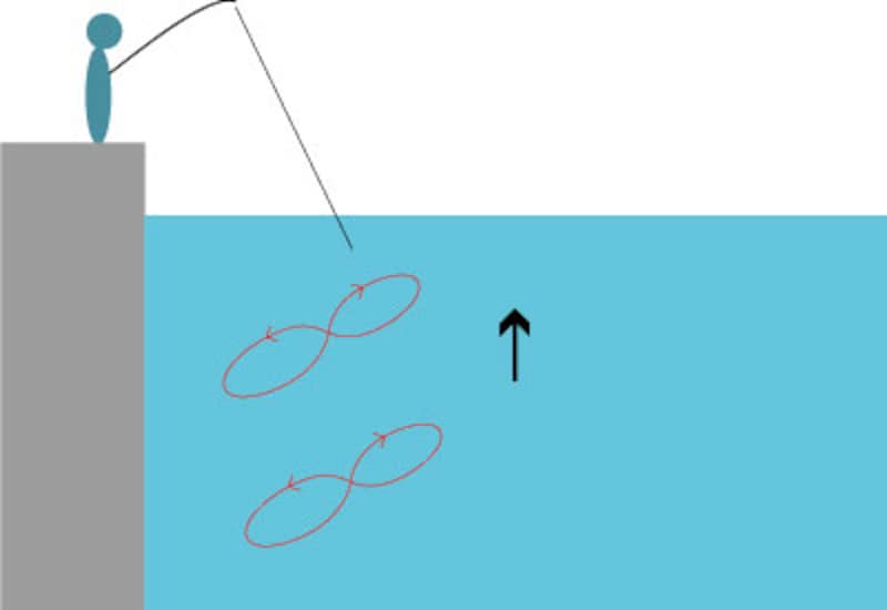 上の図を見てもらえば分かるようにこのルアーはロッドのティップを頂点とした八の字運動をするのが最大の特長。ロッドの跳ね上げ方と緩める幅によってアイスジグのスケーティングの幅は調整できるのでその日の活性に合わせてやればよい。日中なら深い層から誘い上げるようにして、夜なら表層から徐々に落としていっても構わない。うまくアイスジグを動かしてやると、日中にストラクチャーに隠れているメバルがワラワラと出てくるのでかなりエキサイティングな釣りができる。