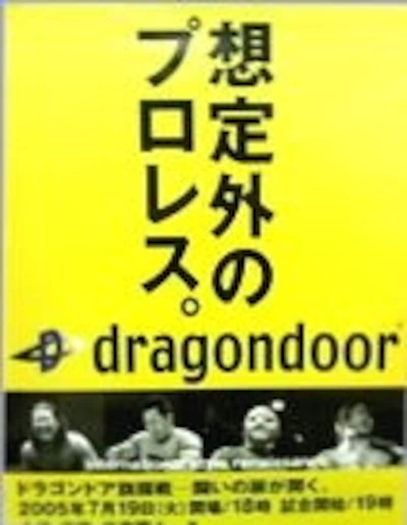 今もなお、dragondoorは「ライブドアのスポンサードを受け、立ち上がったプロレス団体」と説明されることが多く、あたかも既成事実のように報道されている。しかしながら、実際のdragondoorは、ライブドアから多額のスポンサードを受けている事実もなく、その名称もライブドアとの提携ありきで命名されたわけでもない。遡ること1ヶ月半。2005年4月27日、dragondoorプロジェクトの発表会見を実施したのは、元闘龍門ジャパンの川畑憲昭氏だった。「有限会社闘龍門」を母体に、ウルティモ・ドラゴンこと浅井嘉浩が設立したメキシコのプロレスラー養成学校・闘龍門の卒業生らで構成される、新イベントdragondoorの開催を発表。ロゴマークこそライブドアのパロディではあったものの、名称そのものはライブドアというより、袂を分かったかつての所属団体、ドラゴンゲートへの対抗心やアンチデーゼという要素のほうが大きかったようだ。