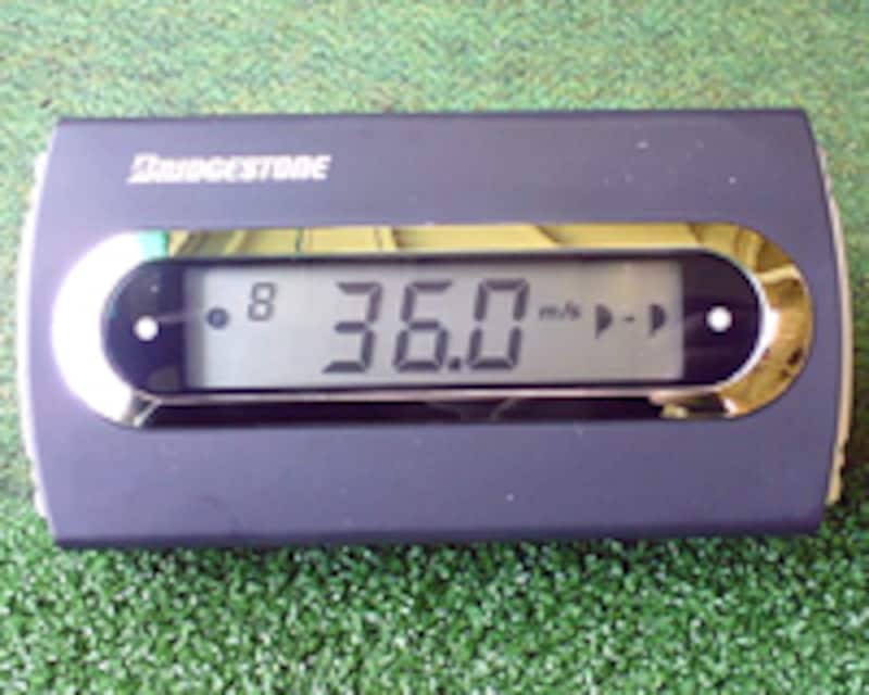 | ヘッドスピード 36.0m/s。ディスプレイ左上に8番アイアンを示す表示 |