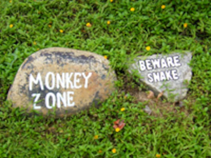 | サルやヘビが生息していることを示す石で出来た表示板 |