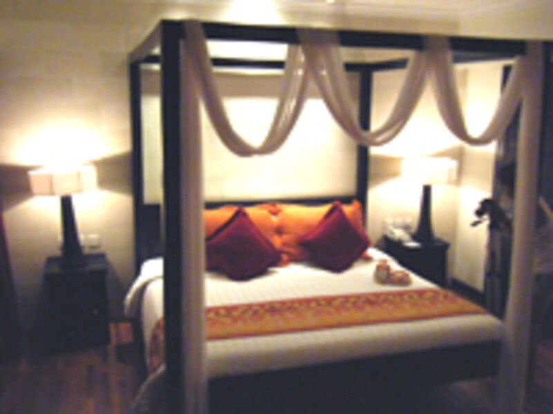 全体で2部屋しかないスイートはさらに贅沢な造り。リビングとベッドルームからなり、たっぷりと広さを確保していて、心地よさを満喫できます。基本的に2名用部屋でありながら、数名がくつろげるゆったりしたリビングには、簡単な書き物などが出来るデスクもあります。アメニティも充実し、至れり尽くせりという感じ。特にガイドが目をひいたのは、二人で使うには広いくらいの天蓋付のベッド。大き目のクッションを背にベッドでくつろぐと、なんと視線の先には大型の液晶TVが備わっています。照明も温かみのある光で、リゾートの夜をよりロマンチックに楽しむことが出来ると思います。
