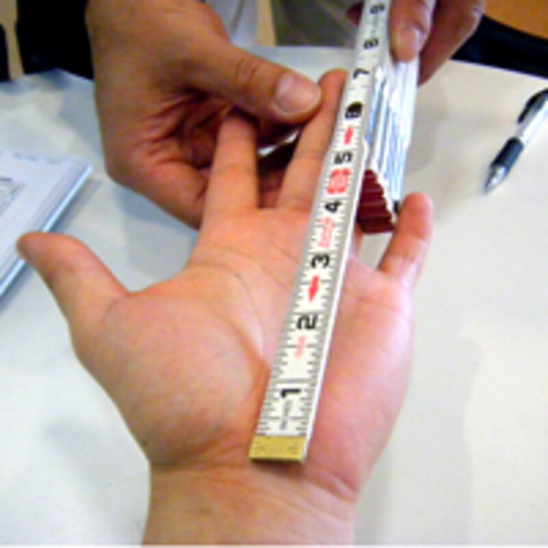| ピンのフィッティングで特徴的なのは、身体測定。手のサイズも測り、グリップサイズを決定する |