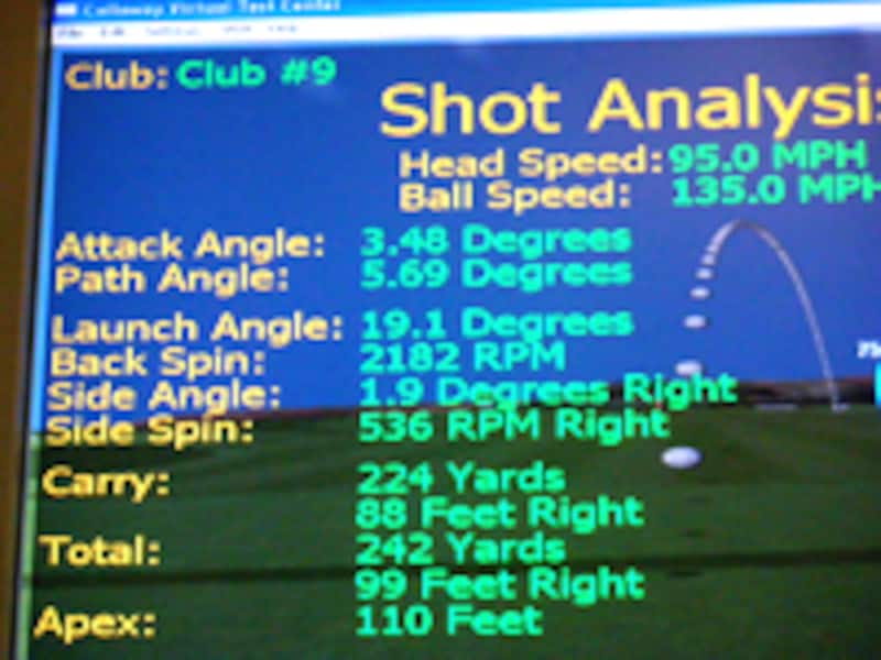 一般的な弾道計測器では、ヘッドスピード、ボールスピード、スピン量、打ち出し角、推定飛距離などが表示されるのが一般的です。キャロウェイの計測器では、さらにAttack AngleとPath Angle、APEX、さらにEFFICIENCYを計測可能。ほとんどが、聞きなれない言葉ですが、これがわかれば、さらに自分のスイング傾向がわかる要素です。