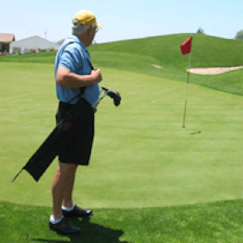 | 「ザ セルフキャディ」の使用風景。グリーン周りにクラブを地面においておくのと比べると、圧倒的に忘れ物防止になる |