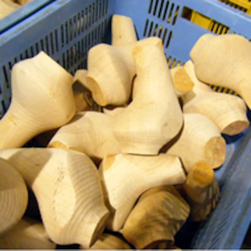 | 十分に乾燥し、大まかに削られたパーシモンブロック。ここで木目や染みの有無などを管理する。天然素材だけに、使用できる質の高い素材は数少ない |