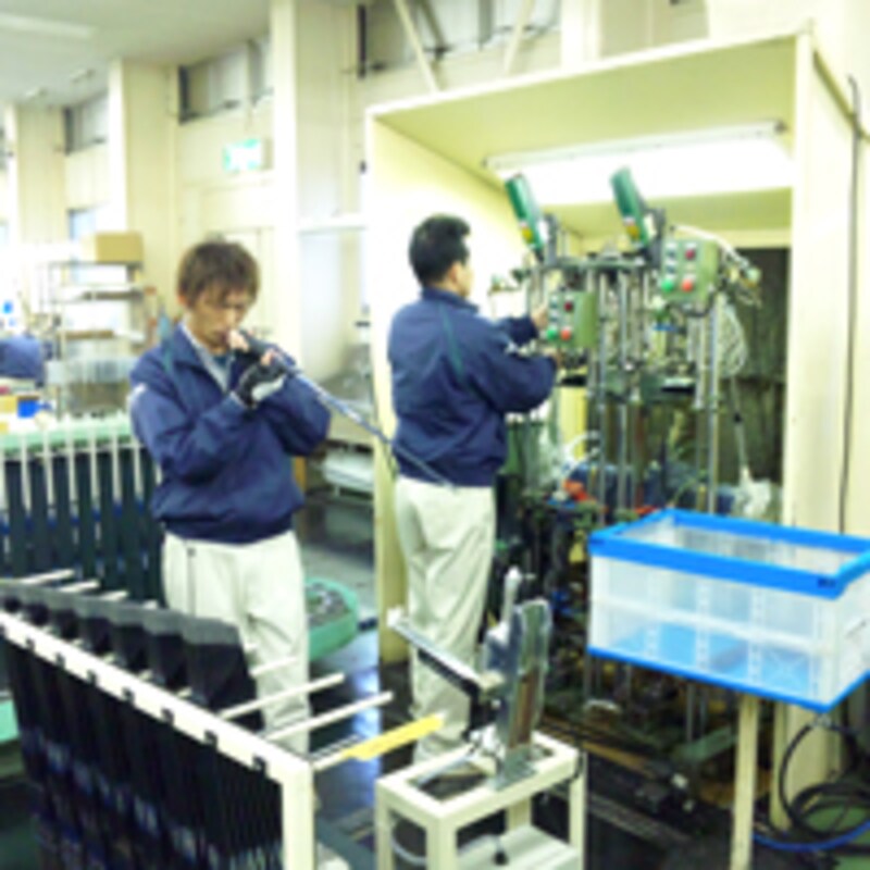 ヘッドができあがると組み立てです。少し意外に思いましたが、グリップ装着やヘッド装着には、専用の機械が用意されていました。機械で装着作業を行い、それを職人さんが目視などでチェックしていきます。