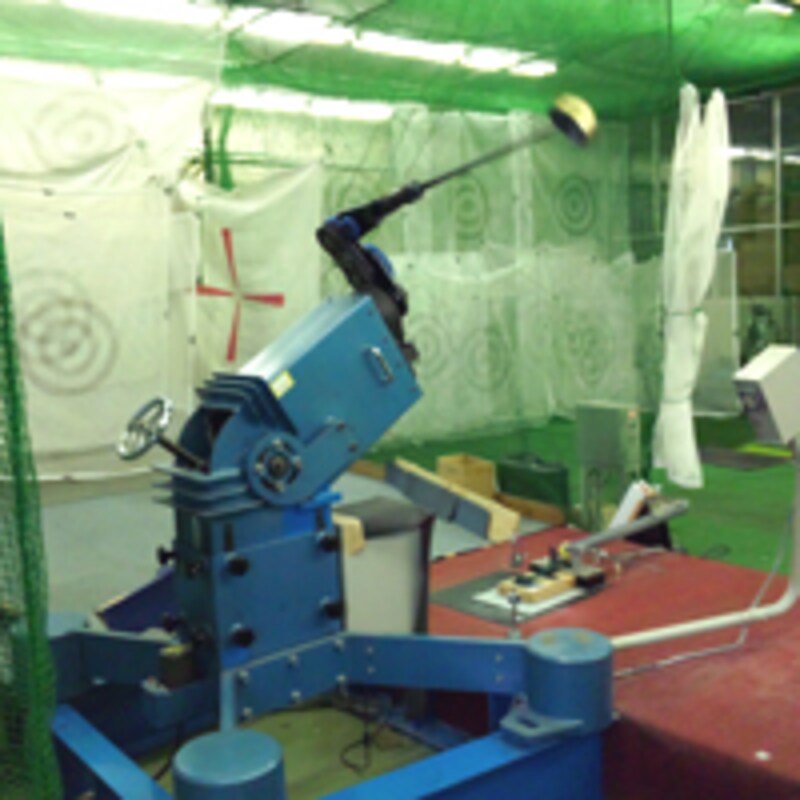| 工場の一角に、ボールを打ち続けるロボットの姿が…。強度テストのため長時間にわたり打球を続ける |