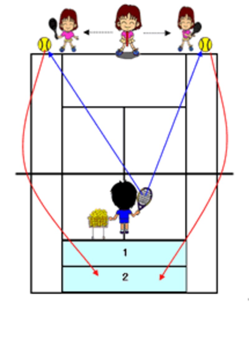 [オーバーヘッド] 青線・・・球出し 赤線・・・ヒット 種目 実施回数 満点 備考 右サイドへ 5回 10点 反対サイドへ入った場合は0点 左サイドへ 5回 10点 交互 10回 20点 ネットへタッチして下がって打つ 合計 40点 ポイントの数え方 ・狙ったエリア 2~1点 ・他のエリア 0点 [ロブ] 青線・・・球出し 赤線・・・ヒット 種目 実施回数 満点 備考 フォアハンド 10回 20点 バックハンド 10回 20点 合計 40点 色付きのエリアの数字が獲得ポイント 前のページへ1…345次のページへ