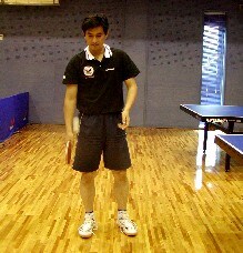 [1]卓球台から少し離れて立ち、ボールを高く投げ上げる