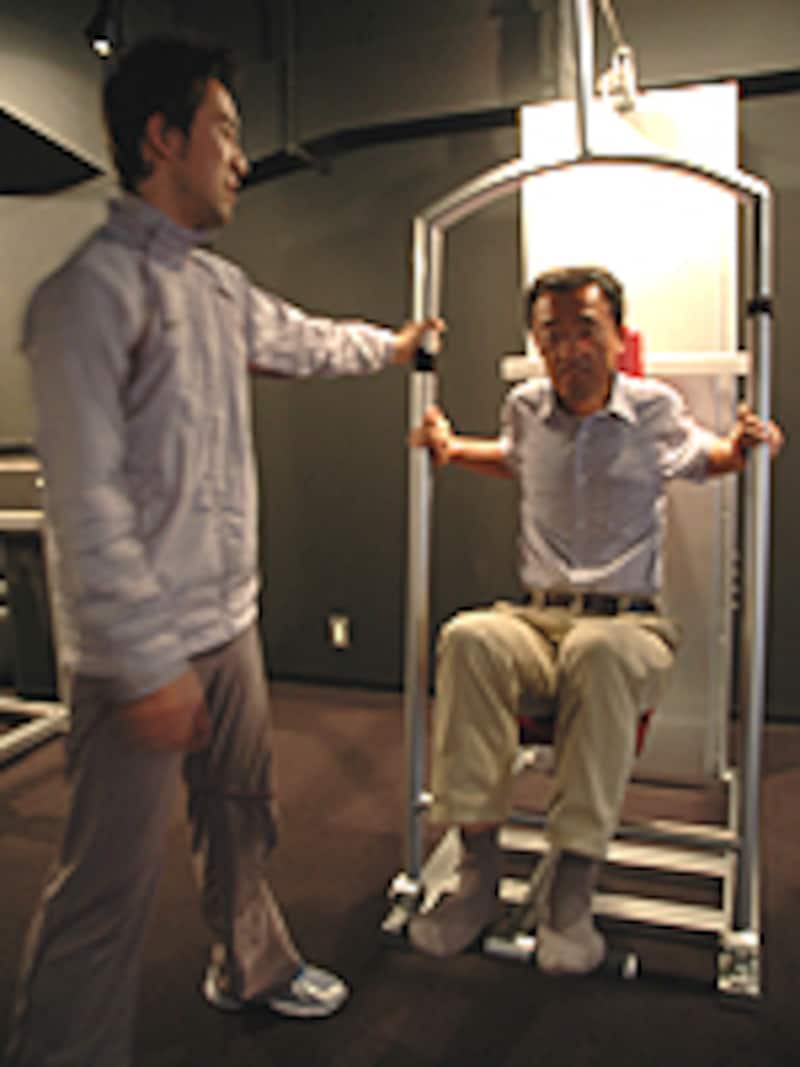 この種のマシンは一般的に手を体の前で合わせるように使用しますが、このマシンの場合、手が後ろに引っ張られます。すると胸郭が開き、腕の振りも良くなり呼吸も楽になるというわけ。「ちょっとやってみましょう」と新田さんに勧められてやってみました。