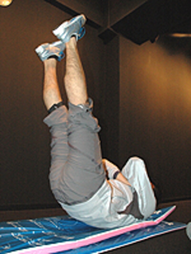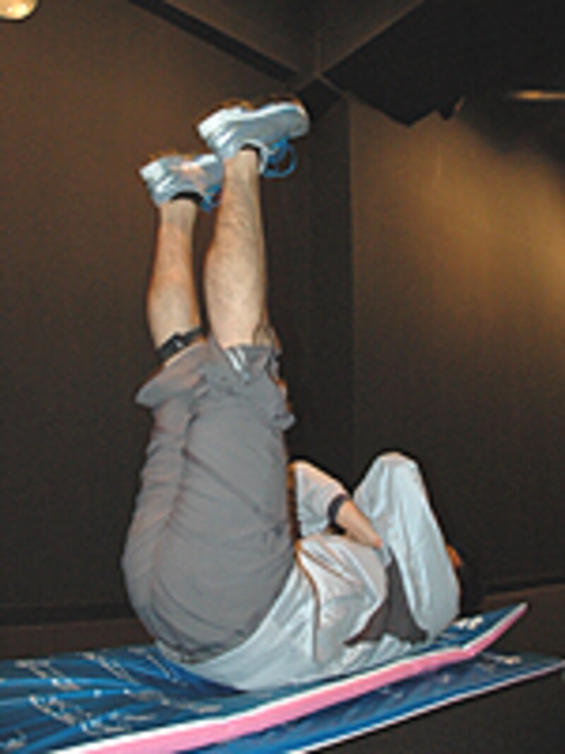 まず仰向けに寝、脚を揃えて真っ直ぐに上に伸ばします。すなわち体は90度の直角状態。ここから反動をつけずに脚を真っ直ぐのまま上に伸ばします。すなわちお尻が浮き上がるわけです。これってかなり腹筋がついていないと無理そう。
