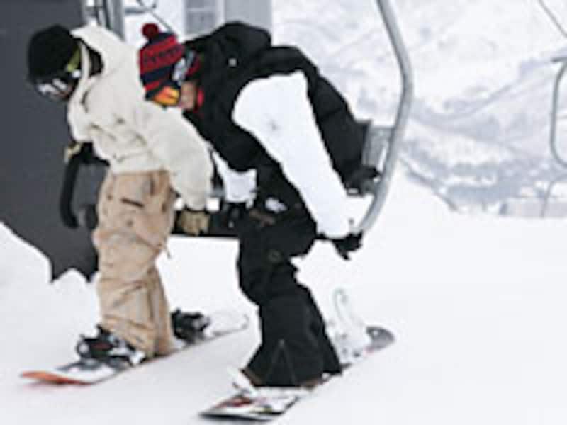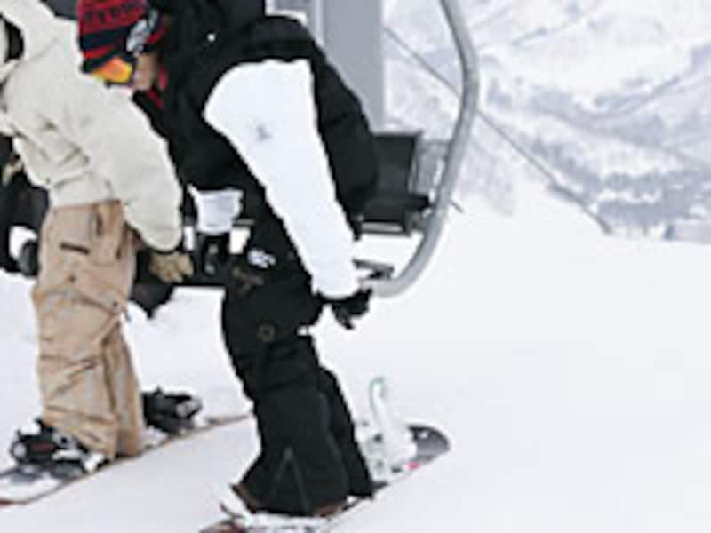 降車位置まで来たら、バインディングをはめていない後ろ足をボードの中央に乗せ、リフトからゆっくりと立ち上がります。