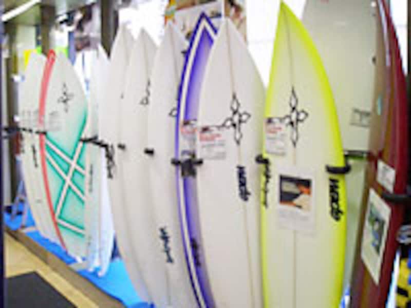 | オフシーズンのサマー期間はサーフィングッズも充実!ミナミのプライベートブランド「ローカルモーション」がこの通りズラリと並びます |